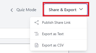 Si damos clic en Share & Export, podemos generar un enlace para publicar, exportar un documento o exportar a CSV el quiz generado.