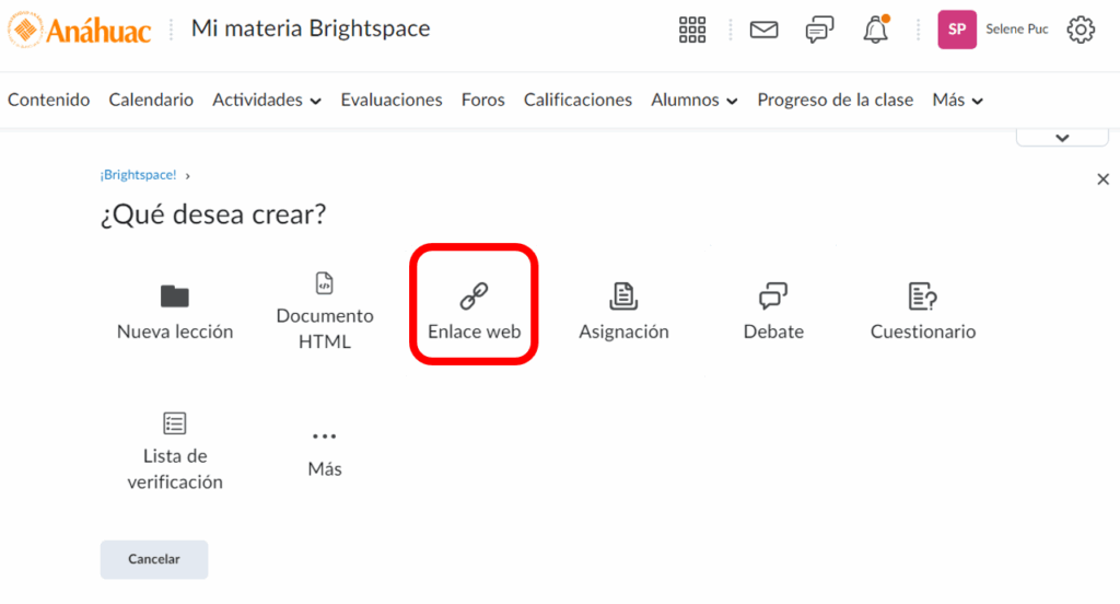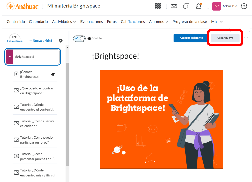 Paso 5.  Para insertar nuestro modelo en Brightspace seleccionamos la opción de crear nuevo.
