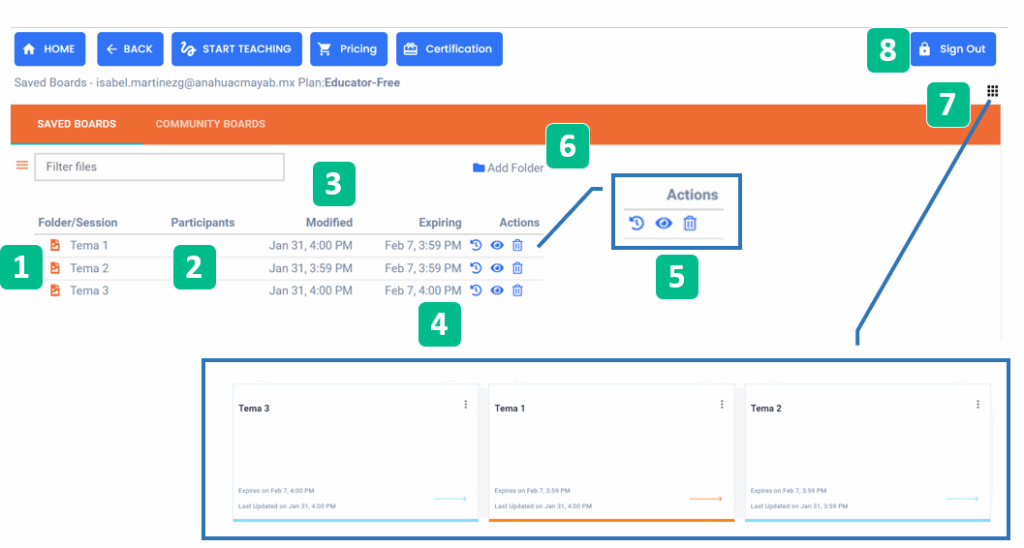 - Actions: en esta parte podrás hacer 3 cosas. La primera es el icono de la flecha y consiste en extender la fecha de caducidad del recurso. El icono del ojito sirve para abrir el tablero y editarlo. Y el icono de la basura es para eliminar el tablero.
