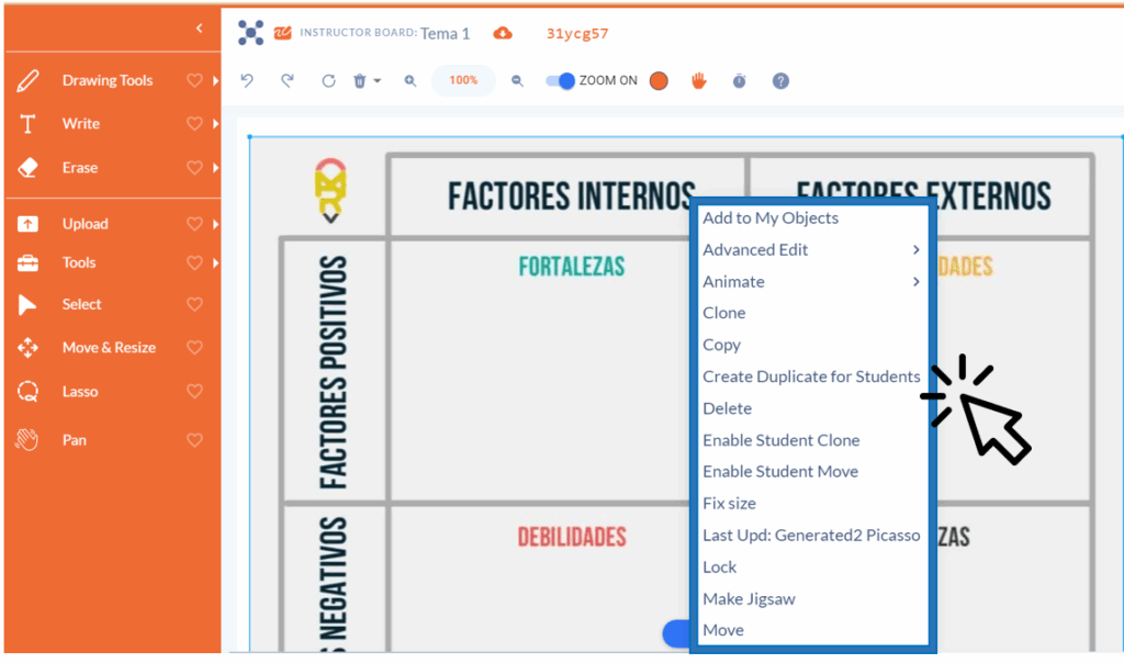 Una vez que aparezca la plantilla o contenido que deseemos, podemos dar clic sobre éste contenido para realizar ajustes. Por ejemplo, se puede habilitar que el alumno pueda mover el objeto o no, se puede ajustar el tamaño, inmobilizar la imagen o por el contrario moverla, copiarla, entre otras muchas funciones que aparecen en la siguiente imagen: