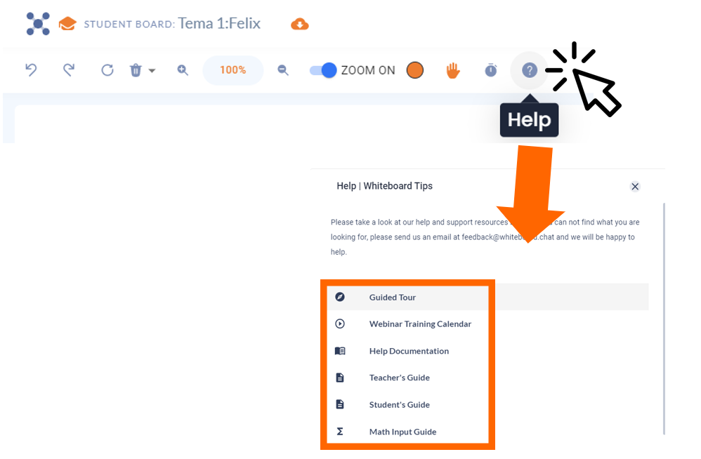Tanto en la vista del docente como del alumno, en la barra de herramientas horizontal ubicada en el lado superior existe un botón de ”Help”. Da clic en este botón y se desplegarán varios recursos de apoyo.