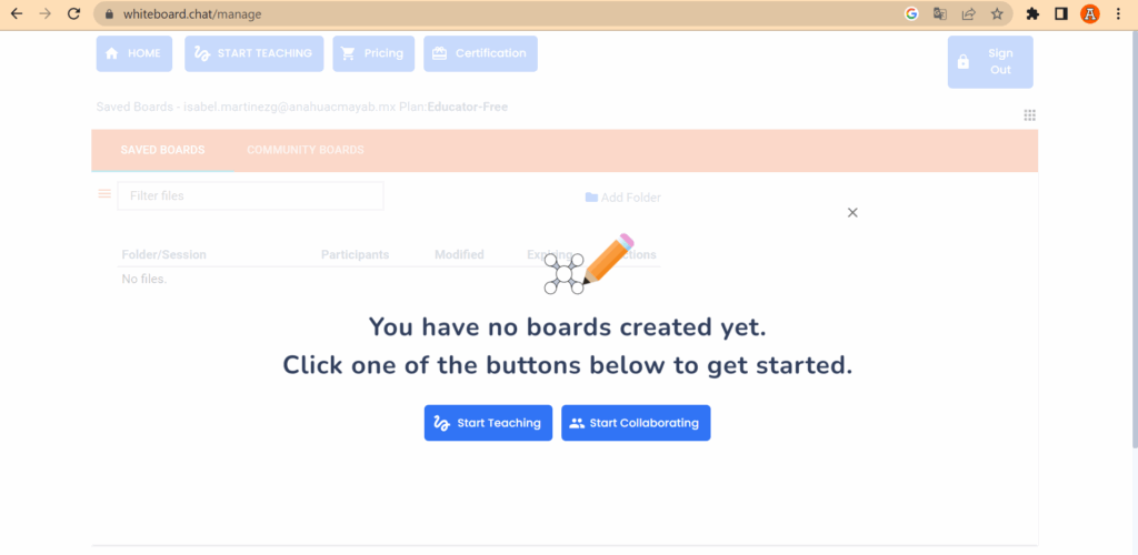 Da clic en ”Start Teaching” para abrir un tablero nuevo.