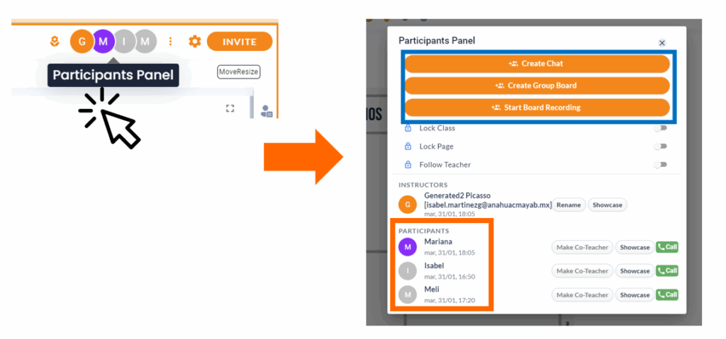 Del lado superior derecho, a clic en donde dice ”Participants panel” y se desplegará el registro de los alumnos. En esta ventana te permitirá varias cosas, entre ellas: