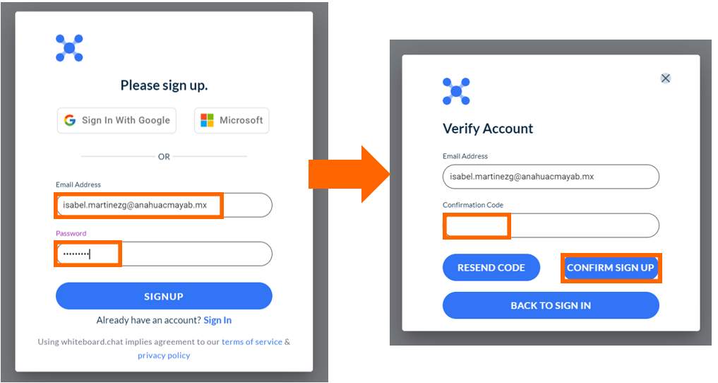 Para ello deberás crearte una cuenta con el correo que desees y asigna una contraseña personal. Posterior a ello, ingresa el código de verificación que te llega a tu correo para activar tu cuenta dando clic en el botón de ”Confirm Sign Up”