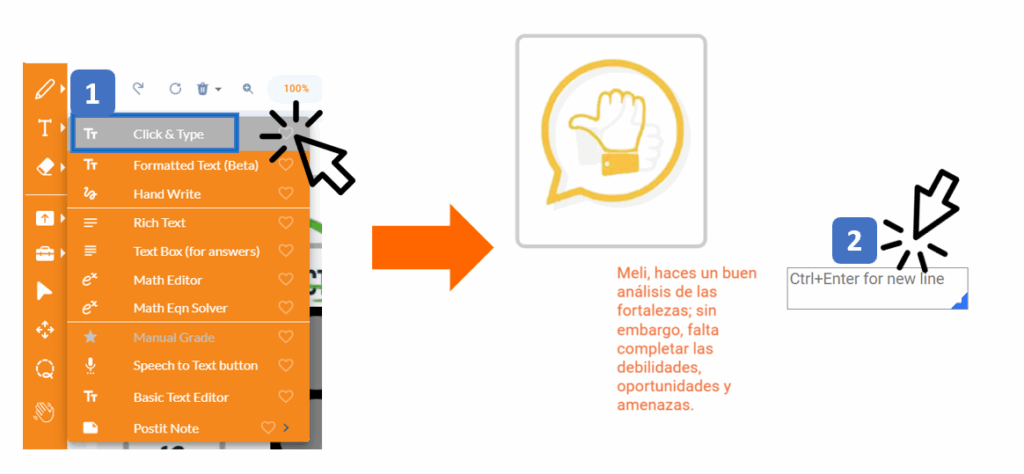 Para ello, da clic en la ”T” que está ubicada en la barra vertical de herramientas del lado izquierdo. Después selecciona ”Click & Type” y da clic en el lugar específico del tablero en donde quieras escribir. Esto lo verá el alumno de inmediato.