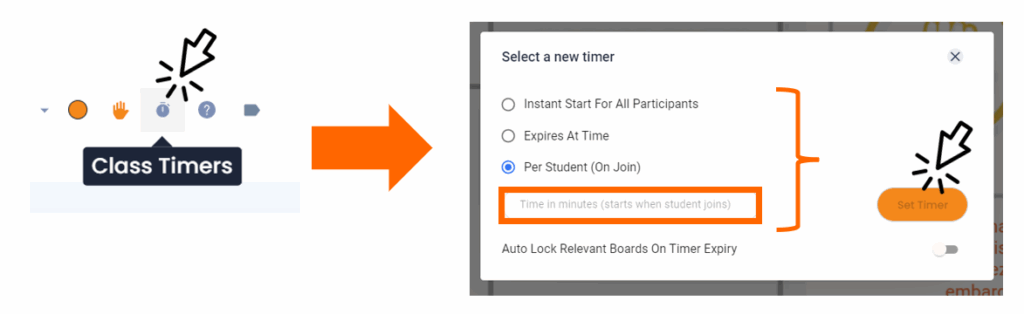 La aplicación permite establecer tiempo para tu actividad; sin embargo es totalmente opcional. En la parte superior del tablero está una barra de herramientas horizontal. Da clic en el botón de ”Class timers” y configura el tiempo a tu gusto.
