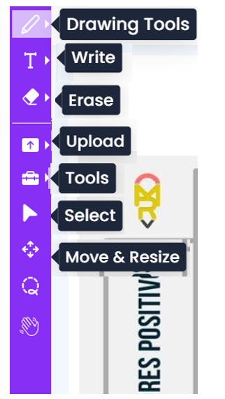 El alumno podrá usar la barra de herramientas vertical ubicada en el lado izquierdo del tablero para comenzar a trabajar. En la siguiente imagen mostramos unas de las básicas: