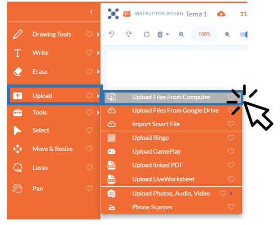 Para ello, el docente ya tiene una plantilla previa de FODA para trabajar sobre ella como base. Para eso, se debe dar clic en ”Upload” y después seleccionar ”Upload Files From Computer”: