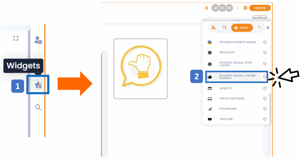 Del lado derecho del tablero ubica la herramienta de ”Widgets” y elige el que te guste más. En este ejemplo se agregó el que dice ”Student Signal: Thumb Signals”.