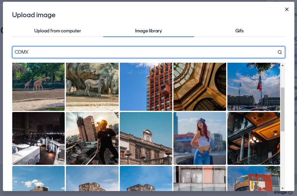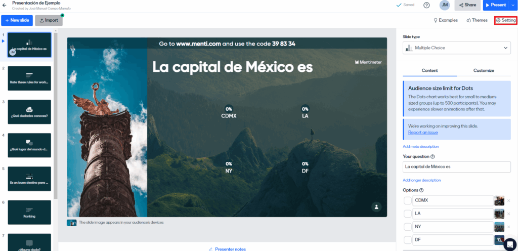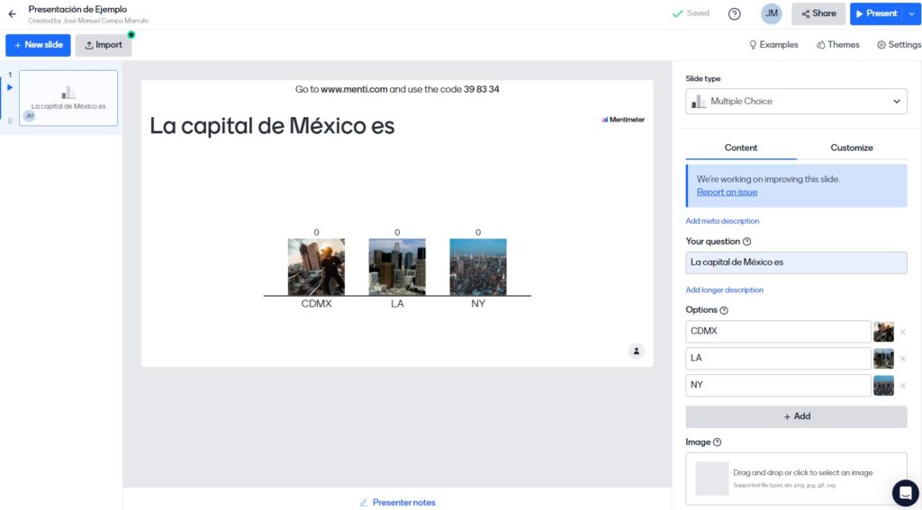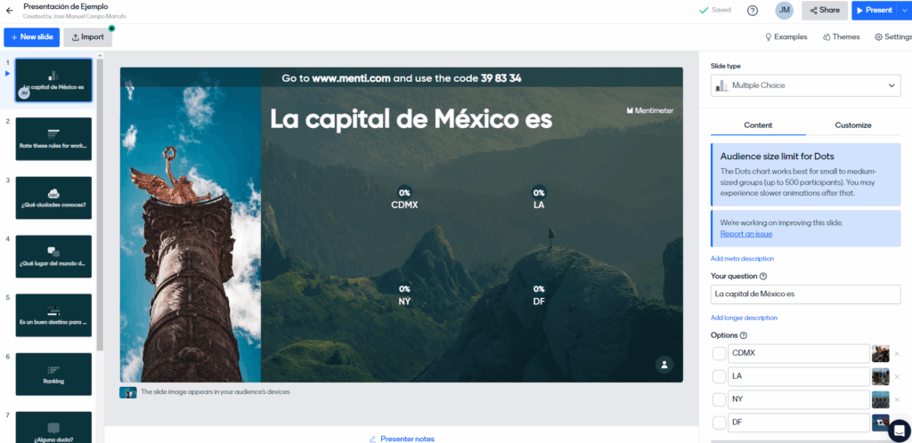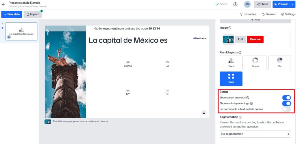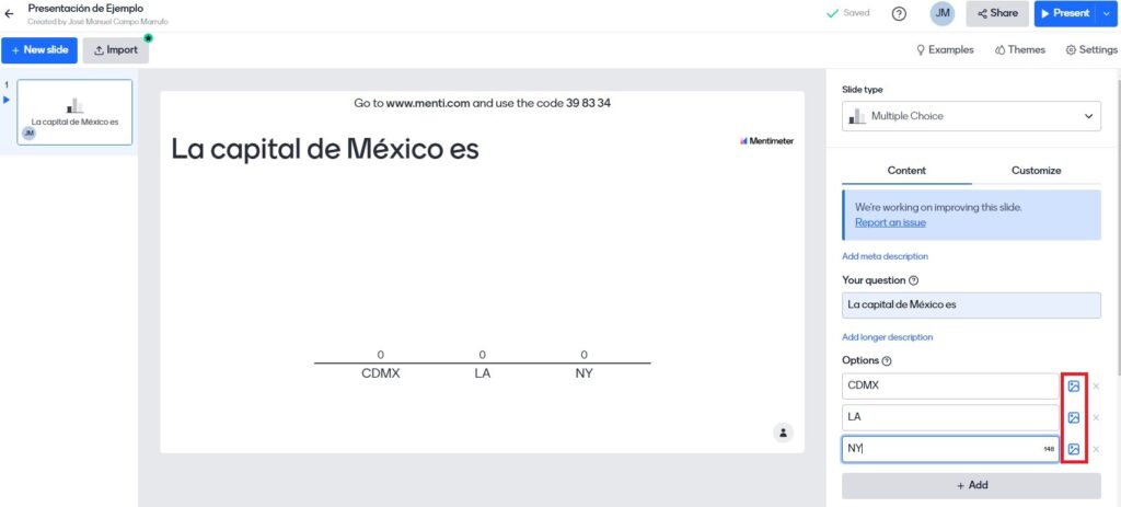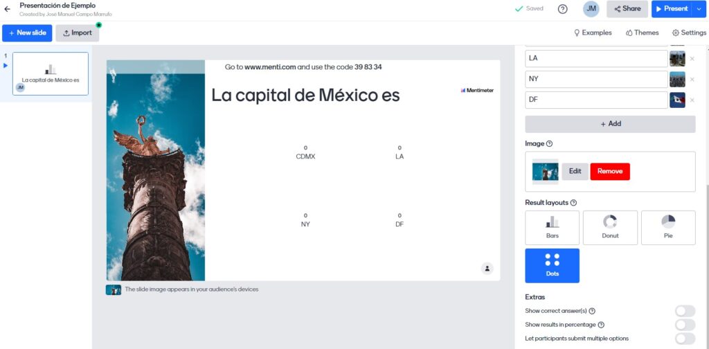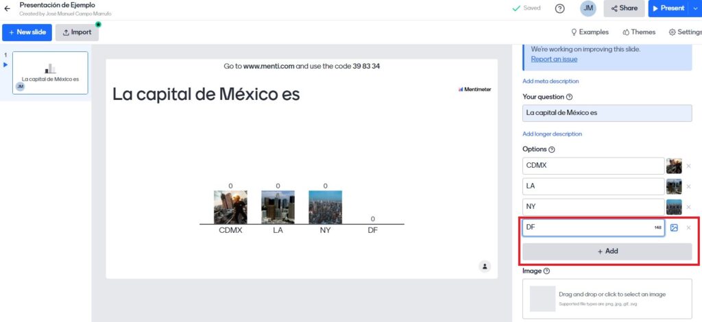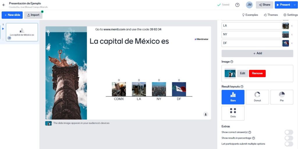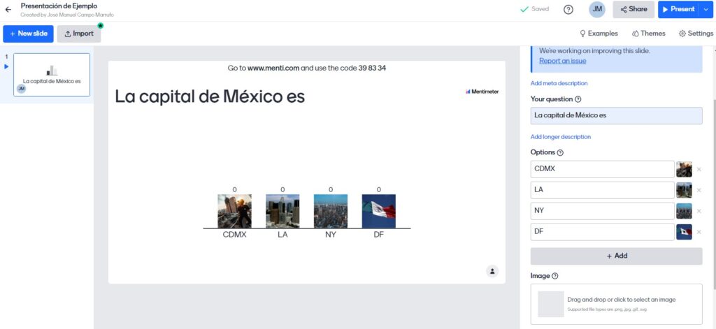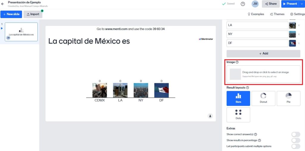 En Image Library podemos utilizar la galería de Mentimeter para adornar nuestra opción de respuesta. En la imagen podemos ver que he colocado las letras CDMX y nos ha proporcionado fotos que ejemplifican la Ciudad de México