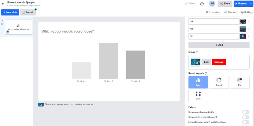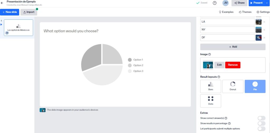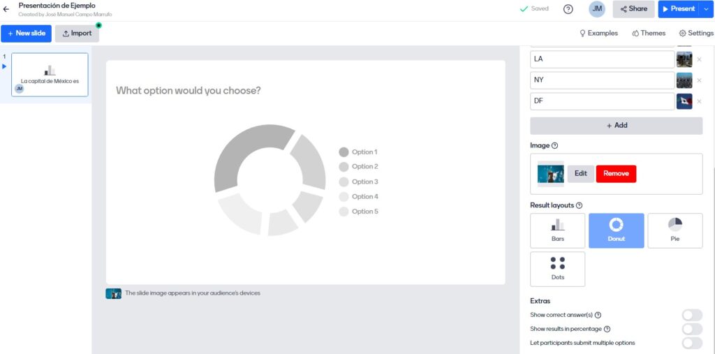 En Extras podemos indicar si queremos señalar la respuesta correcta, mostrar el porcentaje de las respuestas y si queremos que los participantes señalen varias respuestas.