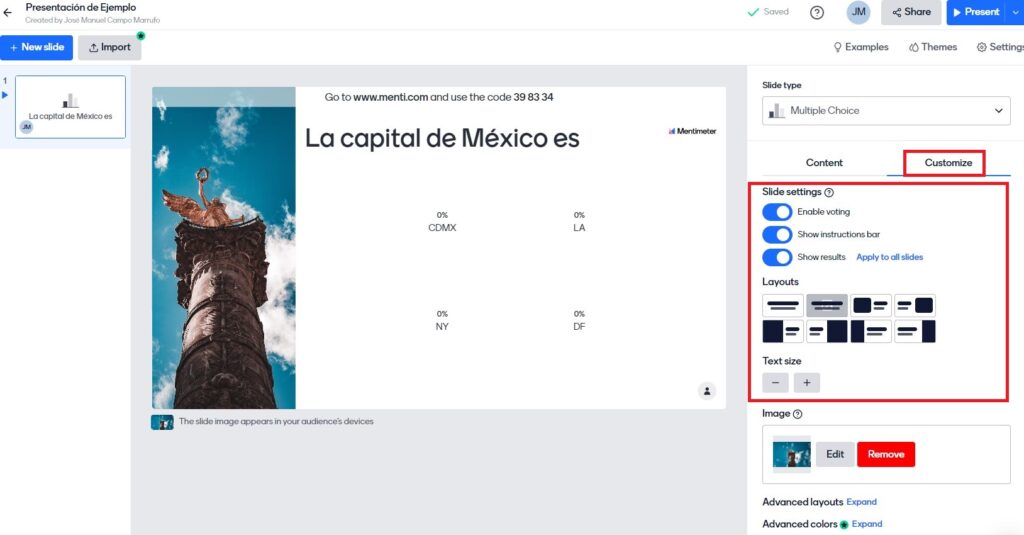 En Custome podemos definir la forma en la que se presentará el Slide, el tamaño del texto, si queremos que los participantes puedan votar y si queremos que se muestre la barra con instrucciones.