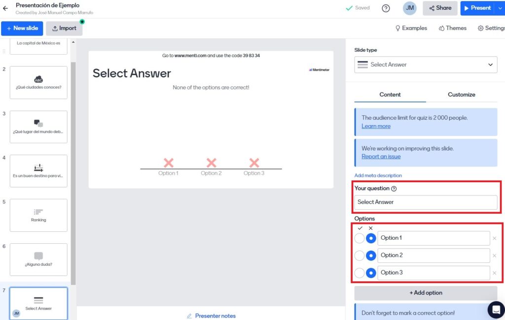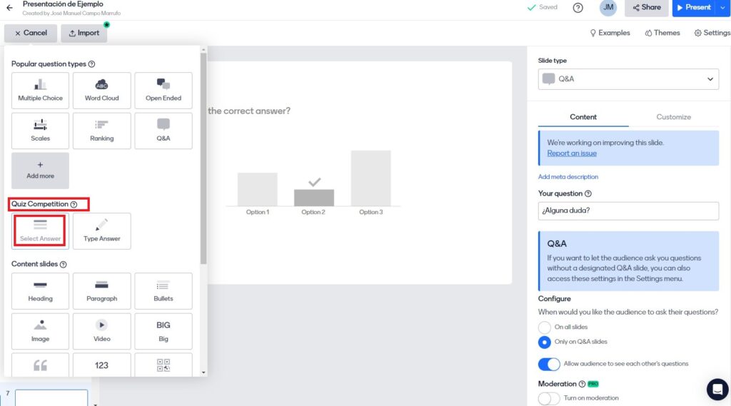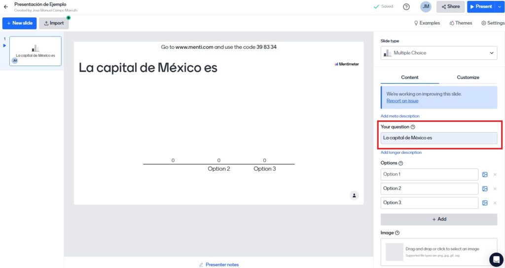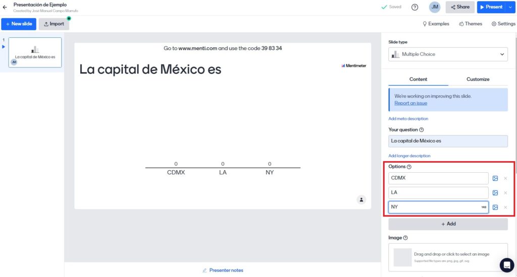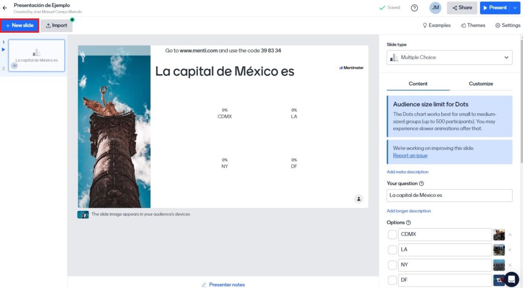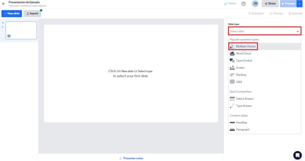 Esta herramienta es muy útil ya que nos permite hacer un diagnóstico inicial de nuestra clase o bien, comprobar aprendizajes al final de la clase. Para usarla, daremos clic en Slide Type y selecionaremos Multiple Choices