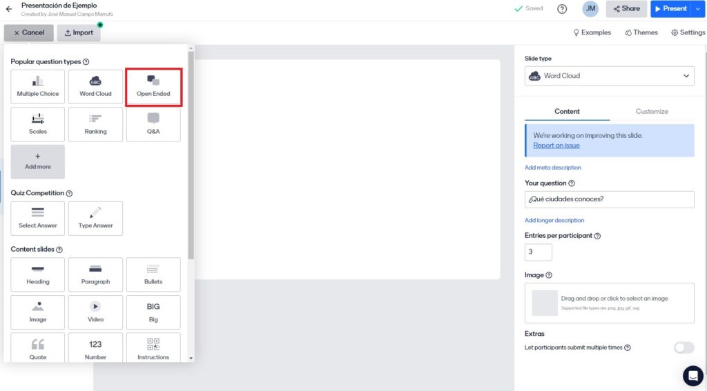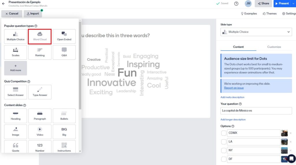 Otra funcionalidad muy popular de Mentimeter es Word Cloud. Para usarla, daremos clic en New Slide y seleccionaremos la opción Word Cloud.