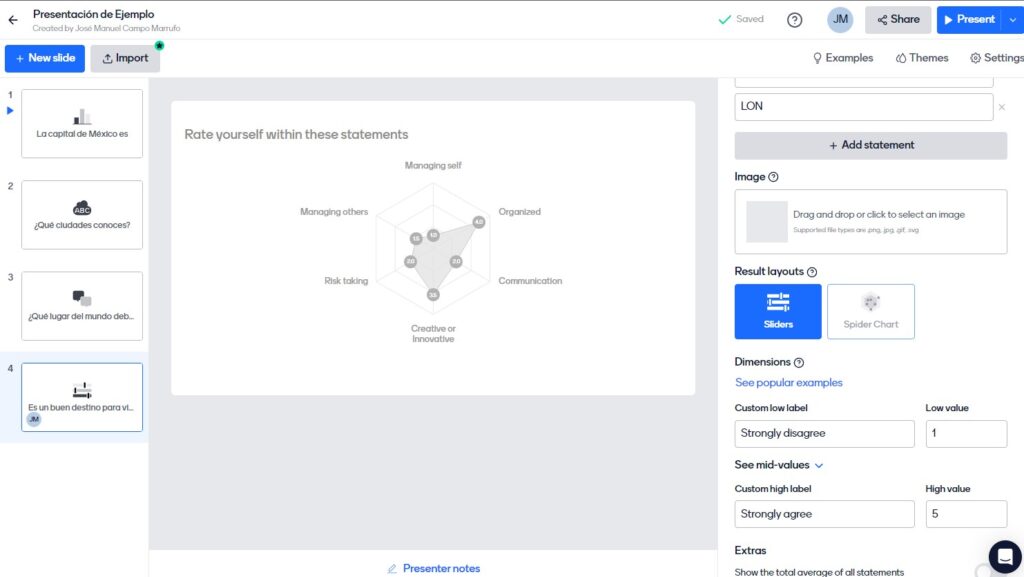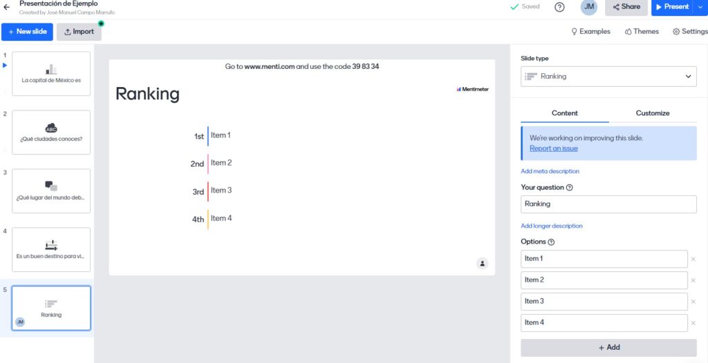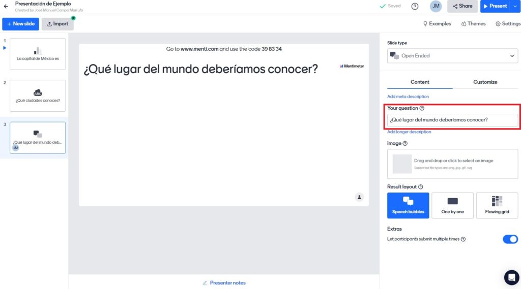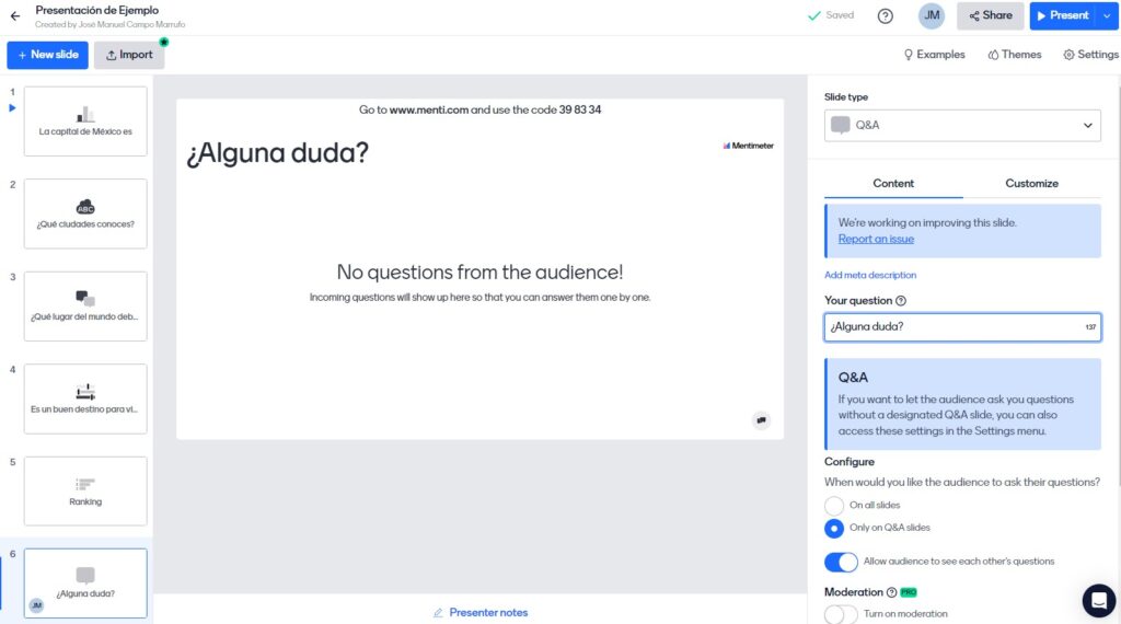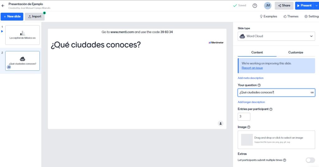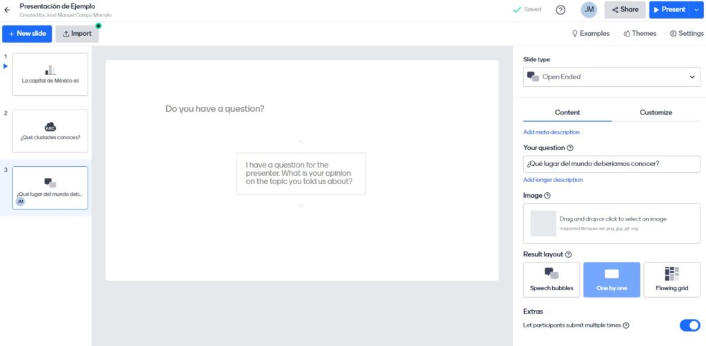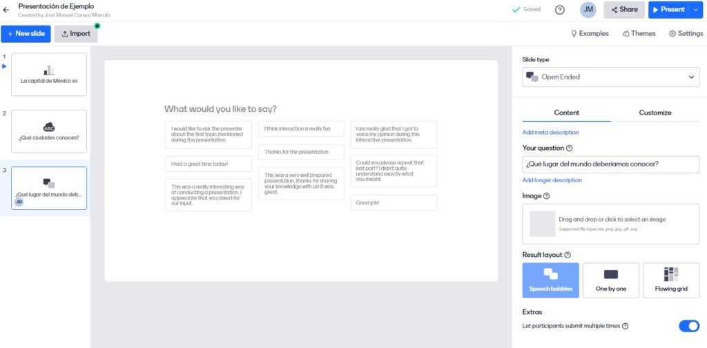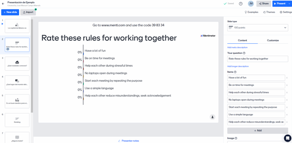 Mentimeter ofrece diversas herramientas que agregan interactividad a nuestras presentaciones pero que de momento no estamos ahondando en ellas ya que son en cierta forma básicas, por ejemplo, Mentimeter puede: