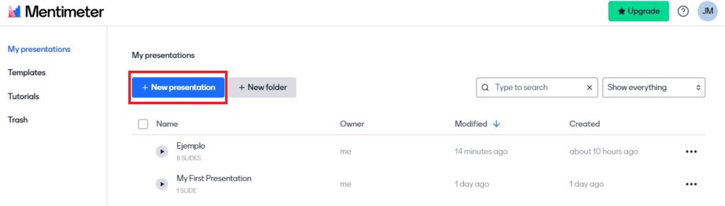 Una vez agregado nuestro correo Gmail Anáhuac, Mentimeter nos enviará a su panel de trabajo. Del lado izquierdo encontraremos una columna con las opciones de My presentation, Templates, Tutorials y Trash. El nombre de las herramientas es autoexplicatico.