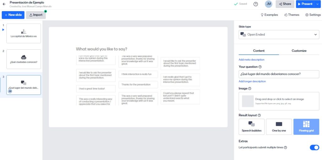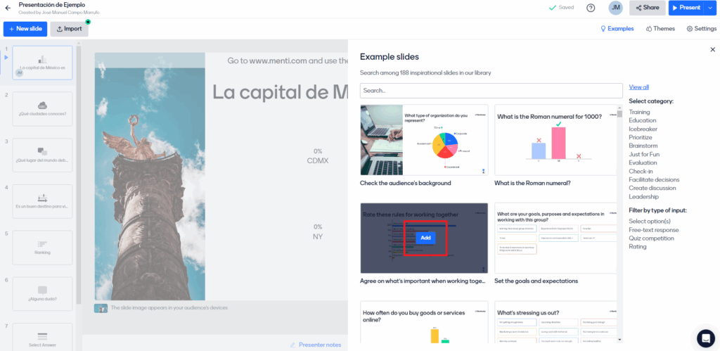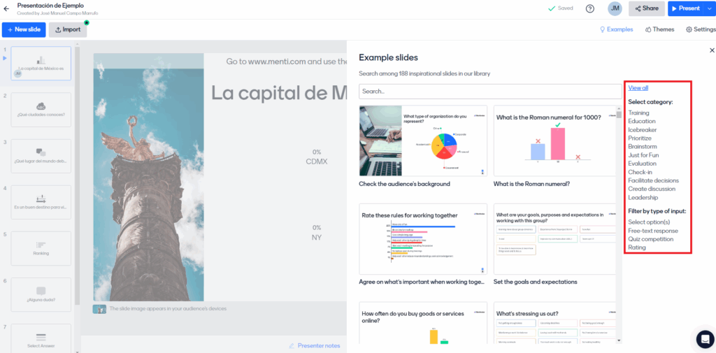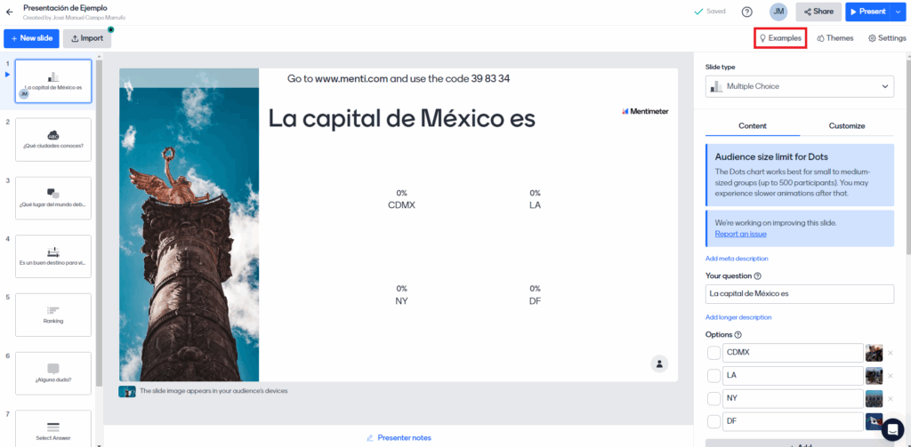 Si damos clic en Examples, podemos revisar ejemplo de Slides creadas por Mentimeter.
