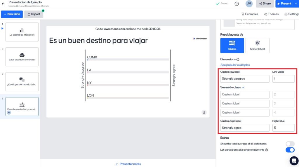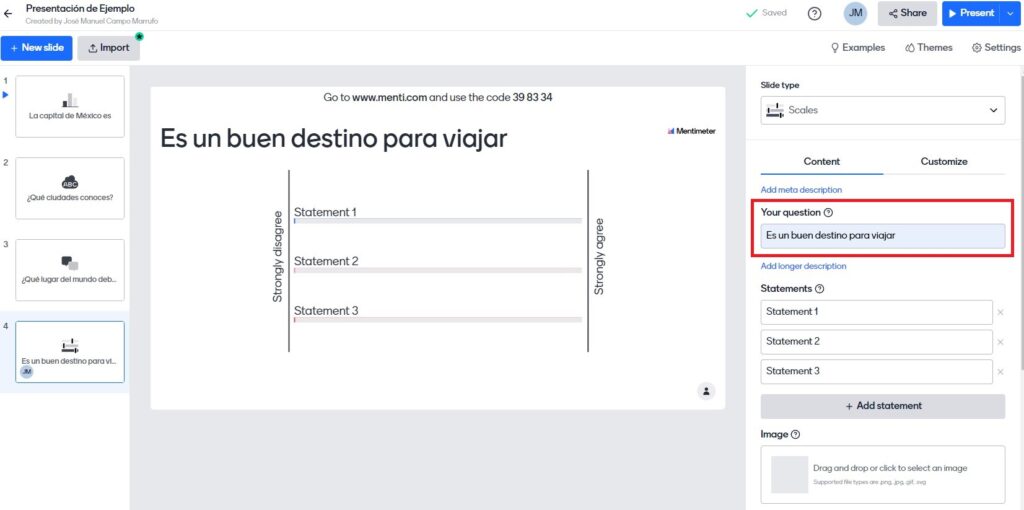 En Scales colocaremos varias declaraciones y los participantes decidirán en que nivel están de acuerdo con dicha afirmación. En Your Question colocamos la pregunta a la cual reaccionarán los participantes.
