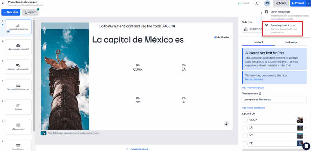 Para revisar lo que hemos creado, podemos irnos a la flecha al lado del botón de presentar y dar clic en Preview Presentation.