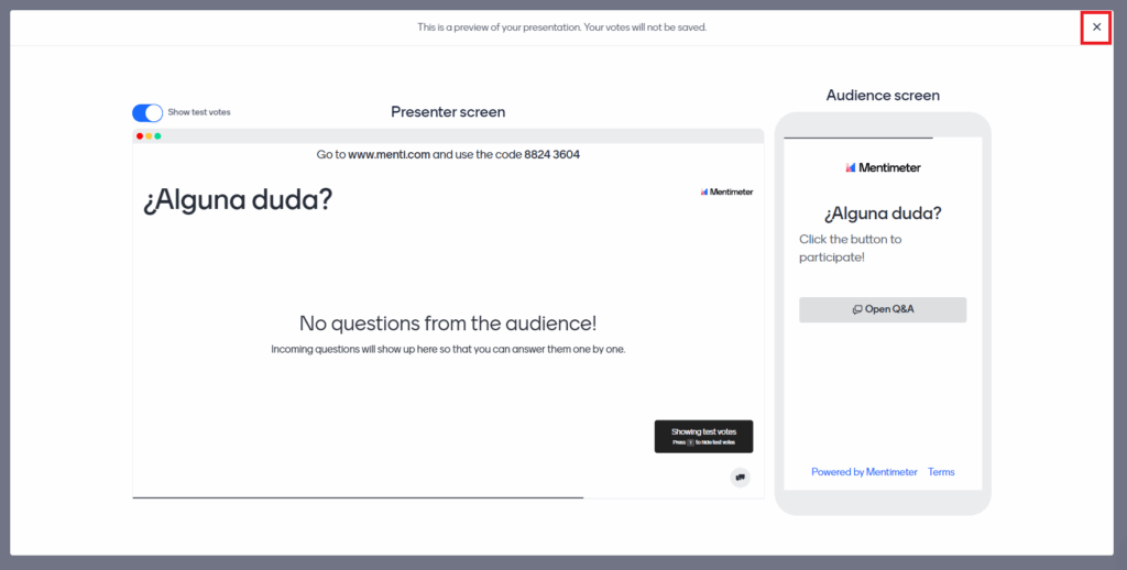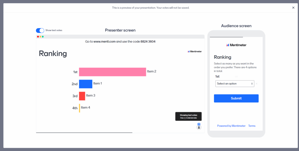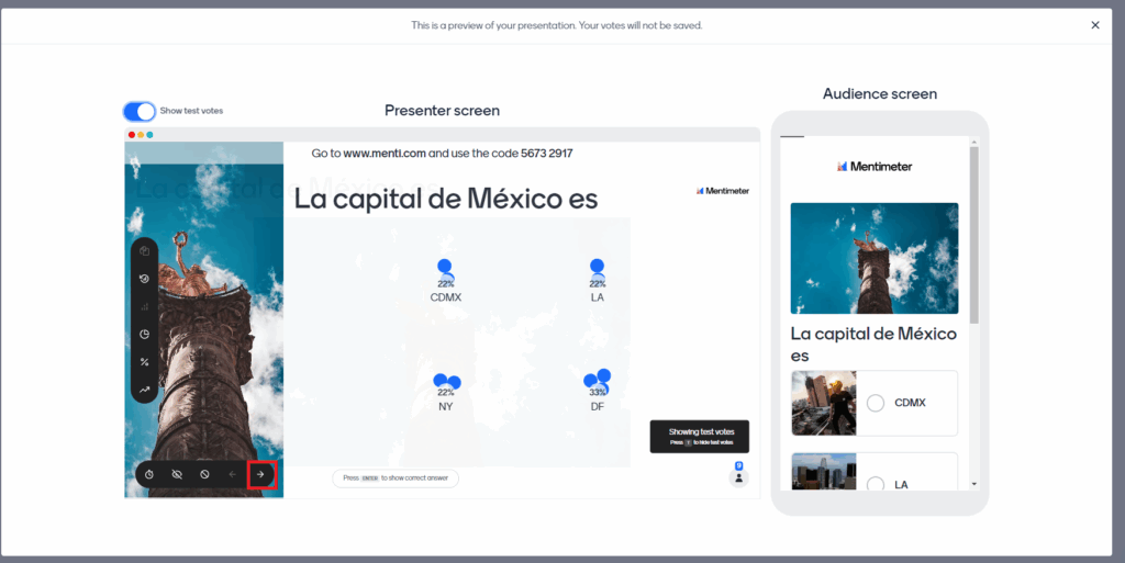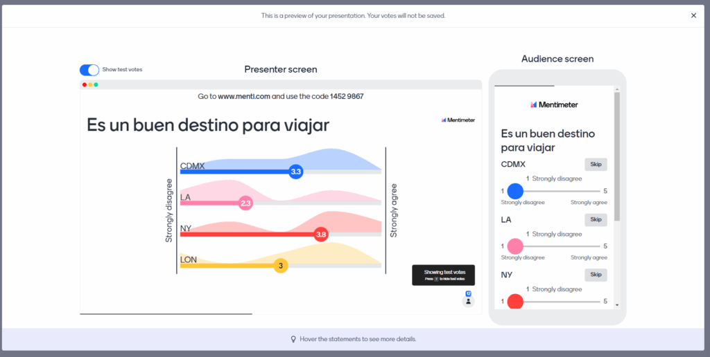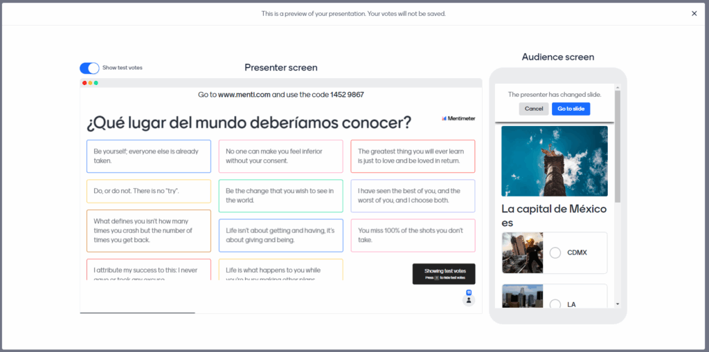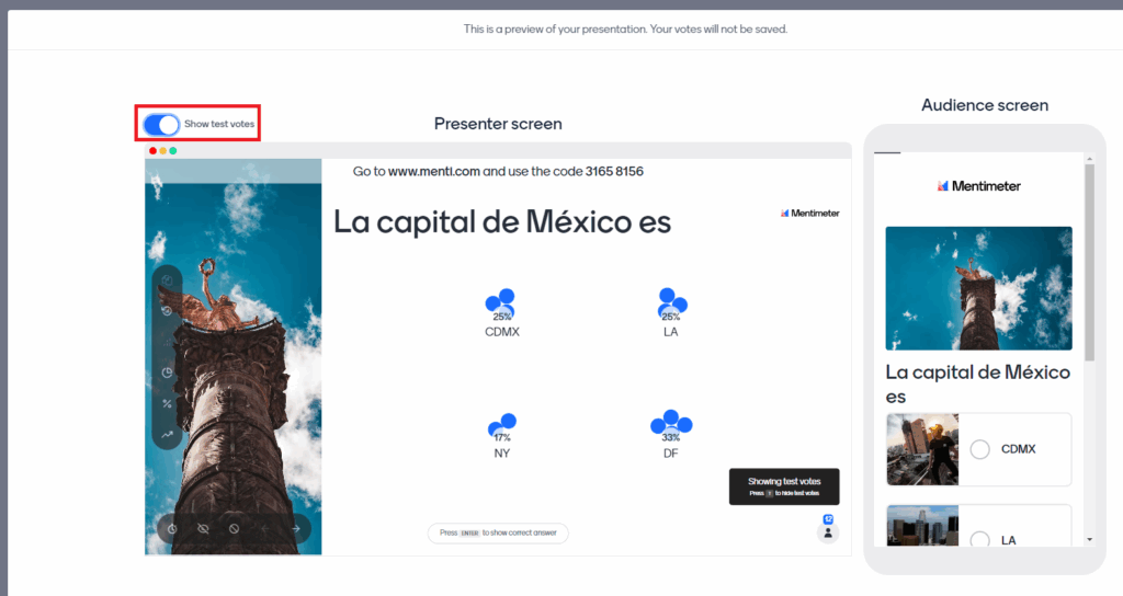 Si damos clic en Shot Test Votes veremos como Mentimeter genera respuestas simuladas para entender cómo se comportará la Slide conforme los participantes respondan.