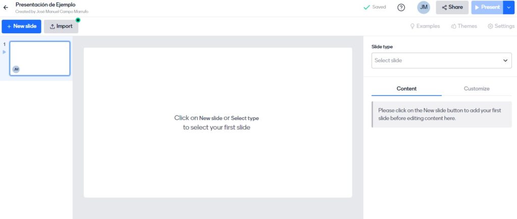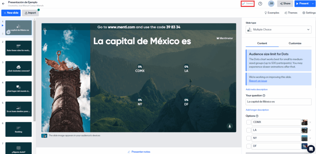 1. En cualquier herramienta, asegurate que tu presentación tenga la palomita de guardado en la parte superior (palomita verde que dice ”Saved”), el guardado es automático; sin embargo, debemos checarlo para no perder nuestros datos.