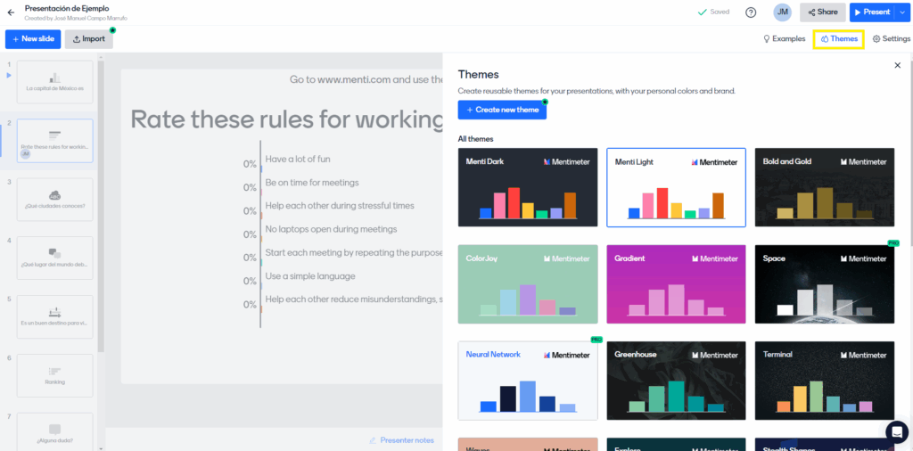 Si damos clic en Themes, Mentimeter nos proporciona estilos de diseño que podemos usar en nuestras Slides.