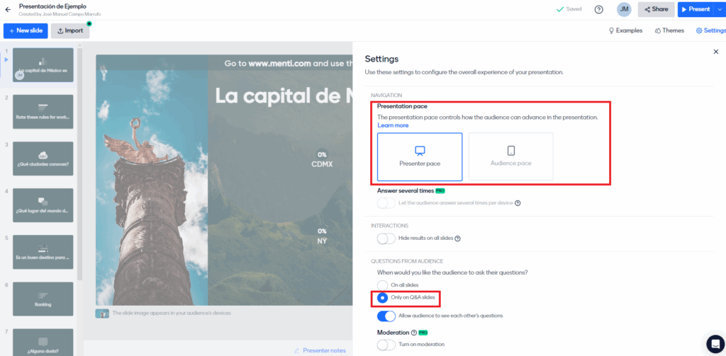Por ejemplo podemos elegir que la presentación sea al ritmo del presentador o de la audiencia, o si queremos agregar Q&A en cada Slide o solo en las Slides de Q&A.