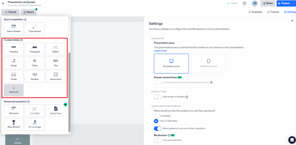 Como lo que deseamos es generar una presentación para interactuar con nuestros alumnos, nos enfocaremos en Participation.