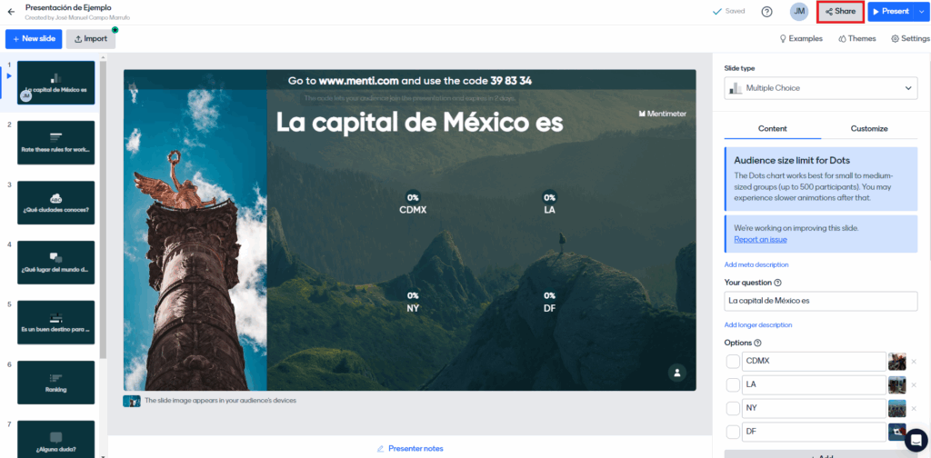 Podemos compartir nuestra presentación dando clic en el botón de Share.