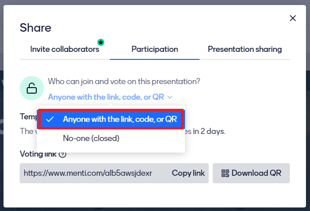 También podemos asignar quien puede entrar a la presentación. Si cualquiera con un código o nadie porque se ha cerrado