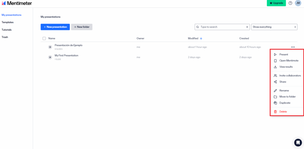 Por otro lado, si das clic en los tres puntos, podrás revisar diversas opciones que tu presentación tiene para ti como duplicar la presentación, o ver los resultados que obtuviste en ella.