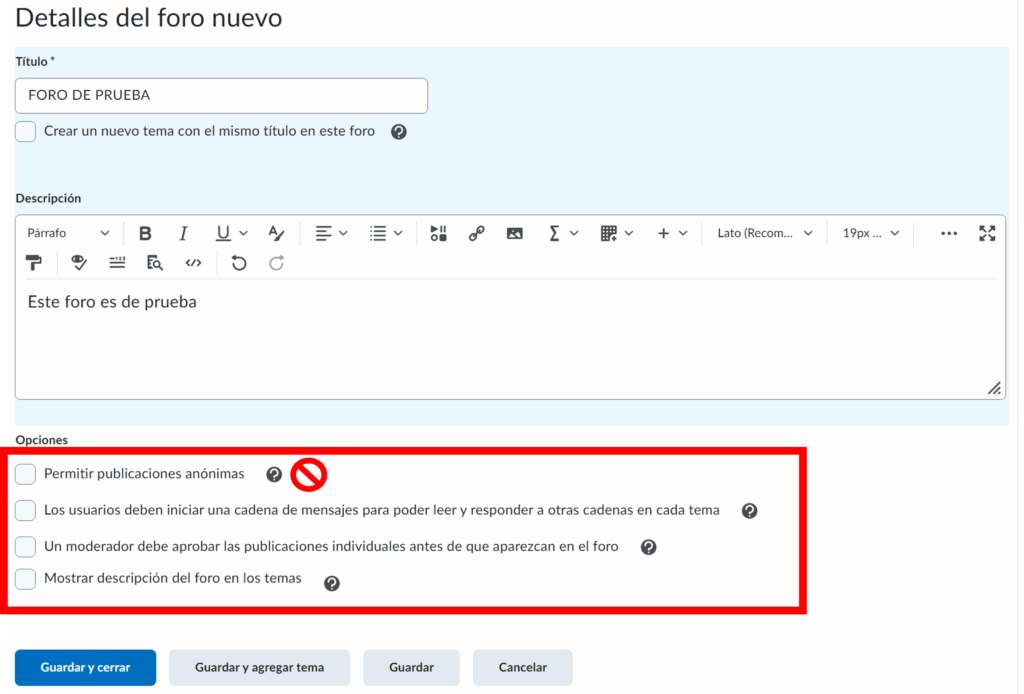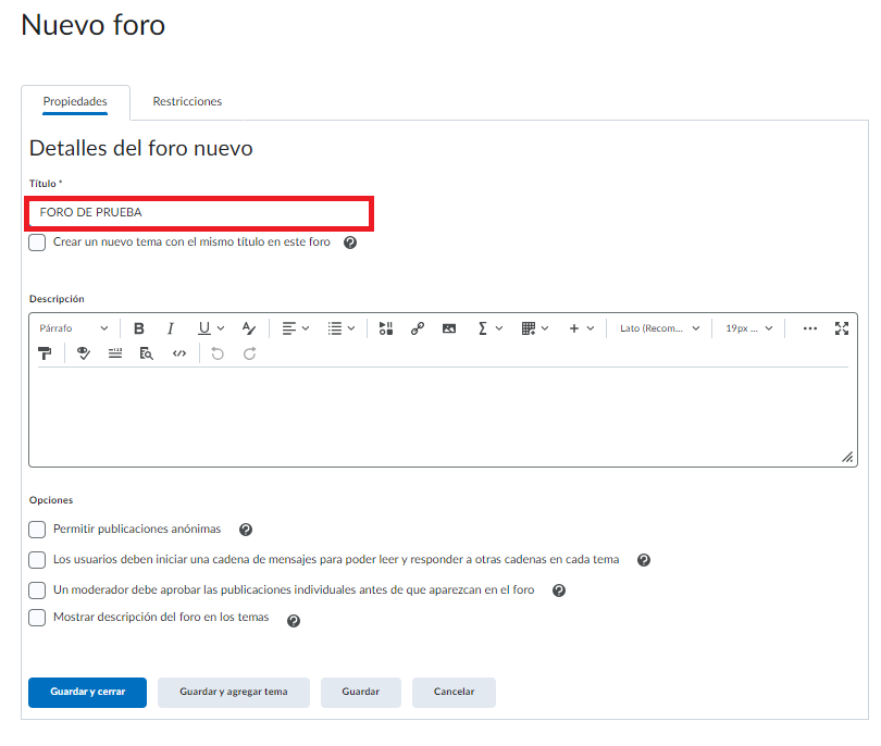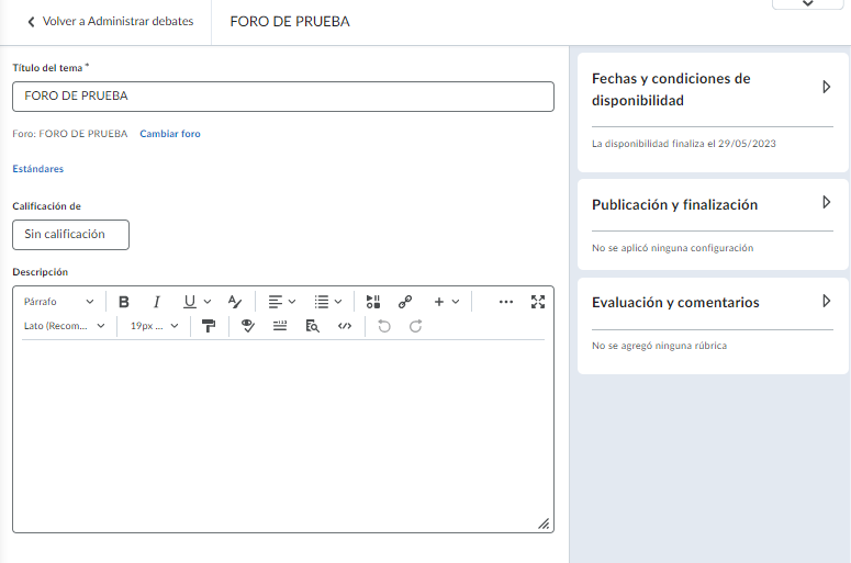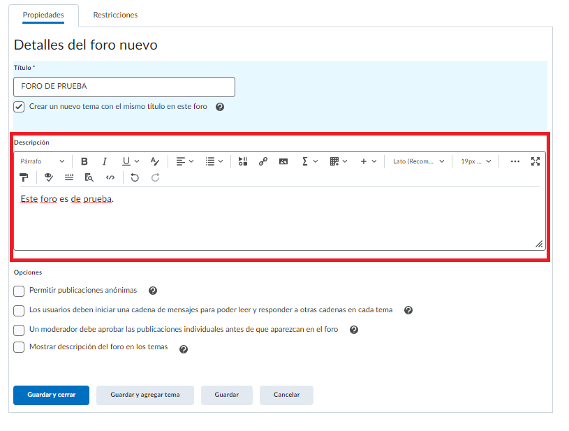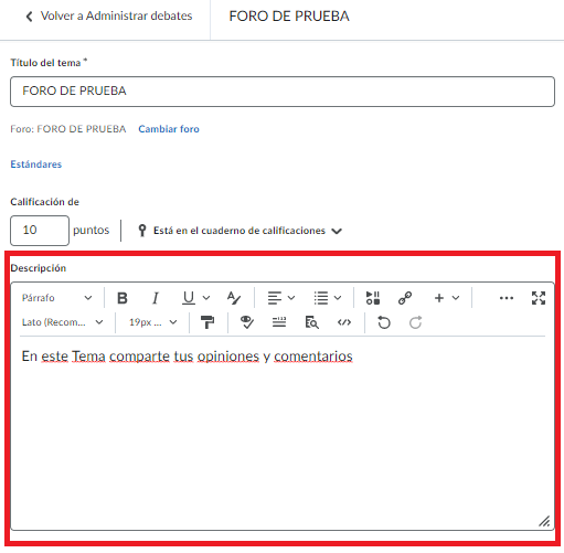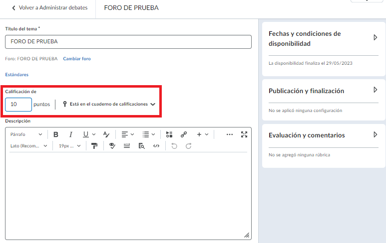 En Descripción podemos agregar las instrucciones de nuestro espacio de discusión. Es importante detallar las reglas, criterios y toda la información necesaria para que a tus alumnos les quede claro qué se espera de ellos.