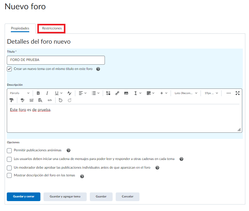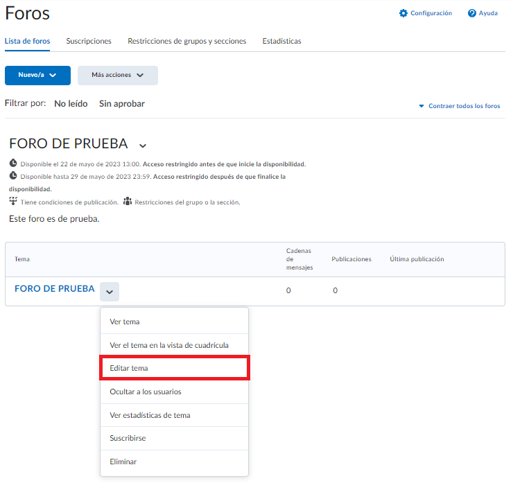 Si no se establecieron condiciones de publicación o restricciones en el foro, podrás establecer esto dentro de los temas.