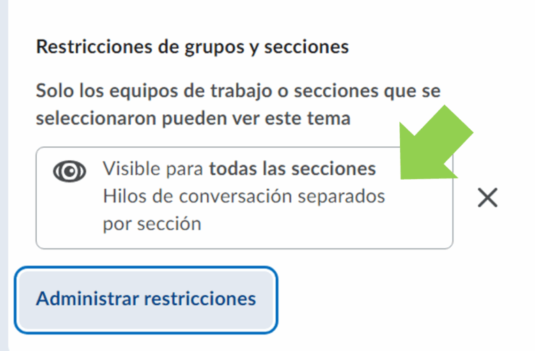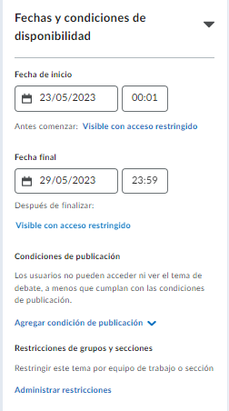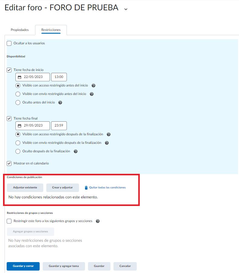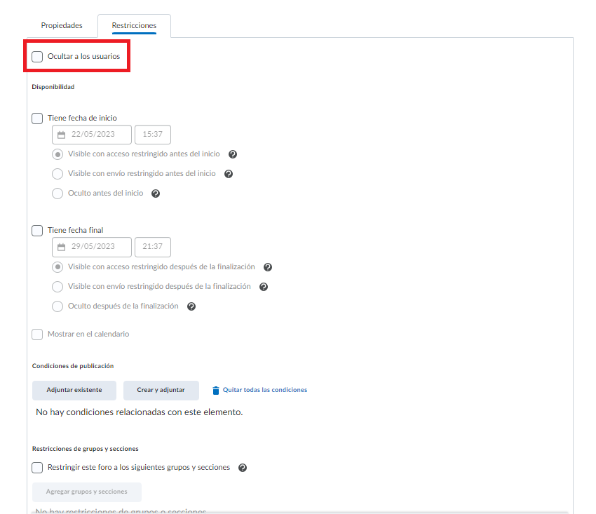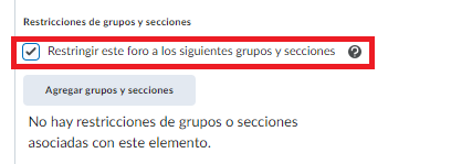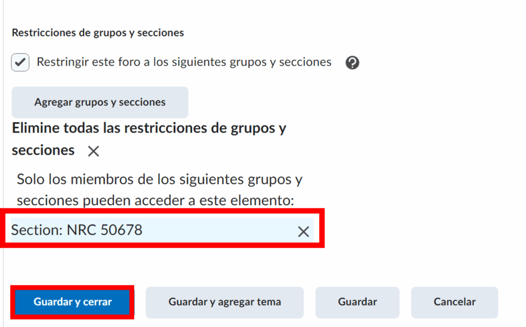 En caso de que quieras restringir el foro a un grupo o sección (NRC) además de ”las condiciones de publicación” también puedes usar el apartado de ”Restricciones de grupos y secciones”.