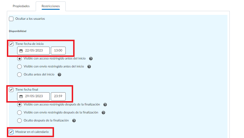 - Recomendamos seleccionar la opción ”Visible con acceso restringido antes del inicio” esto significa lo siguiente: Los estudiantes podrán ver la actividad antes de la fecha de inicio, pero no podrán hacer clic en ella ni abrirla. La información que se muestra a los estudiantes sobre la actividad se limita al título, las fechas y las restricciones.