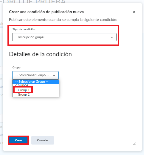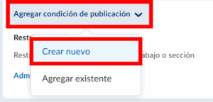 De la misma forma que aparece en los foros, en los temas aparece la sección de ”Condición de publicación”, si damos clic en ”crear nuevo” permite seleccionar bajo qué criterios quieres que este tema sea visible para los alumnos.