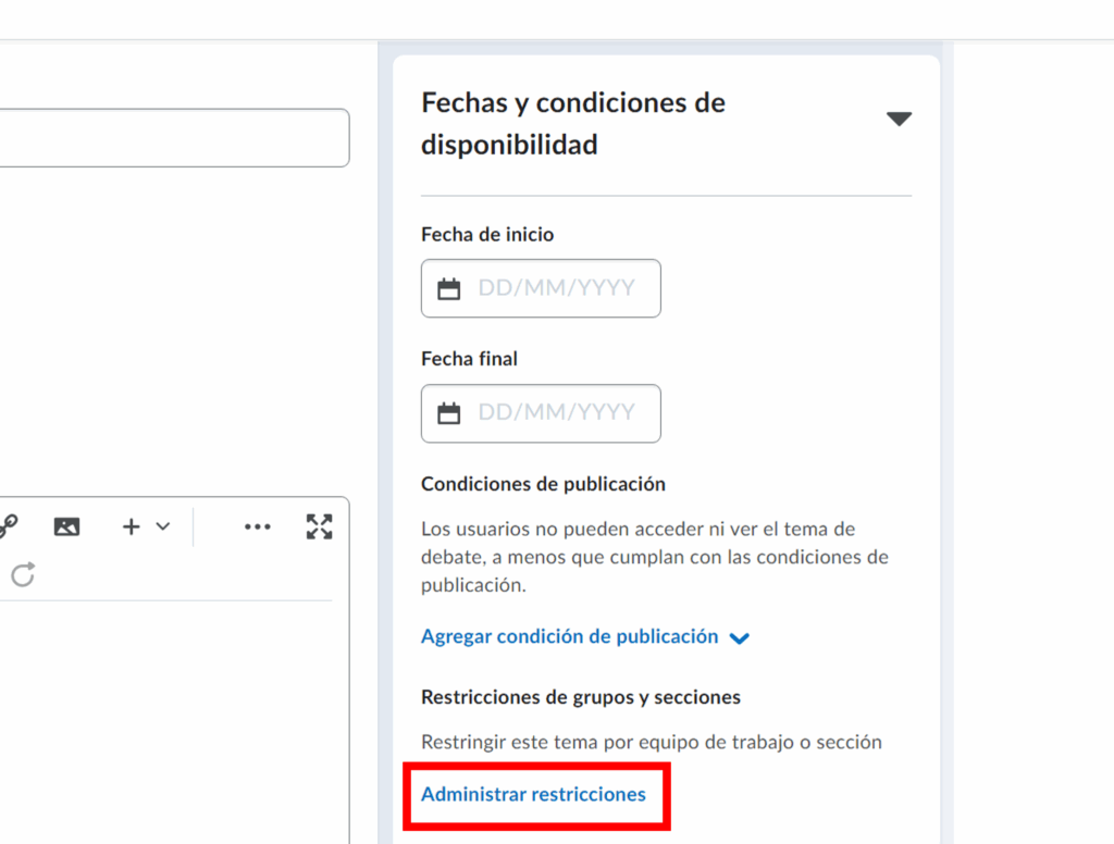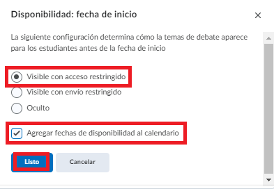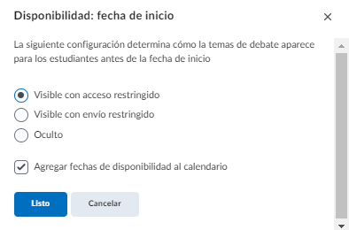 Ahora Brightspace nos permite establecer si queremos que los alumnos visualicen los foros antes y después de estar disponibles para participar en ellos: por eso, debajo de las Fechas de inicio y fechas final, veremos que existe un botón que se titula ”Visible con acceso restringido”