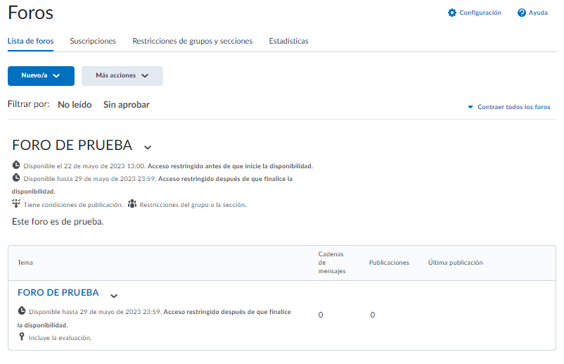 - Fechas: podemos establecer la disponibilidad del foro seleccionado las fechas de inicio y la fecha final.
