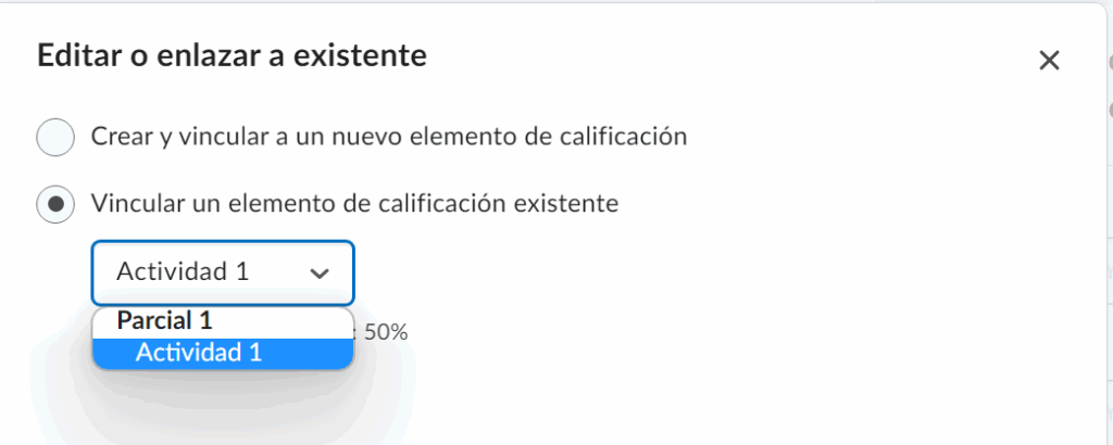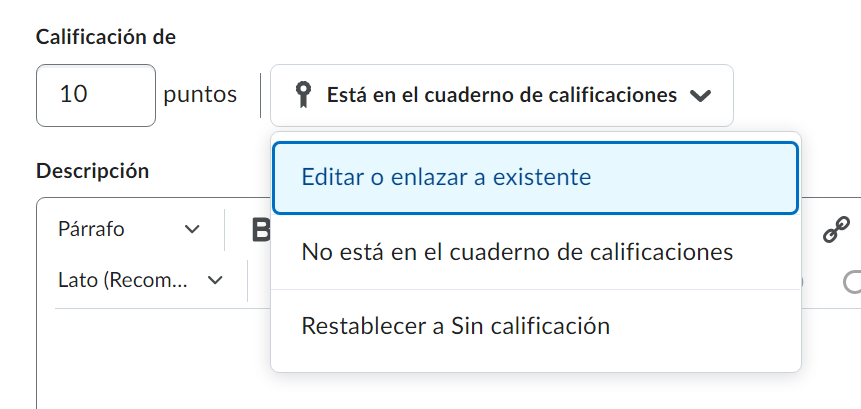 En caso de haber seleccionado ”Editar o enlazar a existente”, se puede ya sea crear y vincular a un nuevo elemento de calificación o también seleccionar uno ya existente.