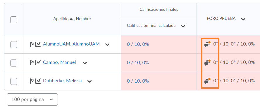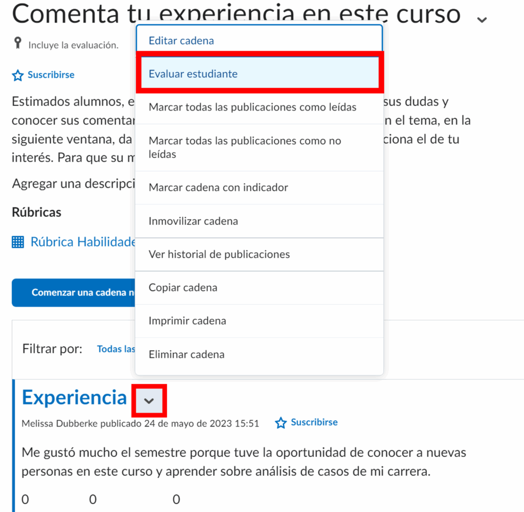 Para poder evaluar las respuestas de tus alumnos, da clic en el tema y posteriormente selecciona ”Evaluar estudiante” en cada uno de los comentarios.