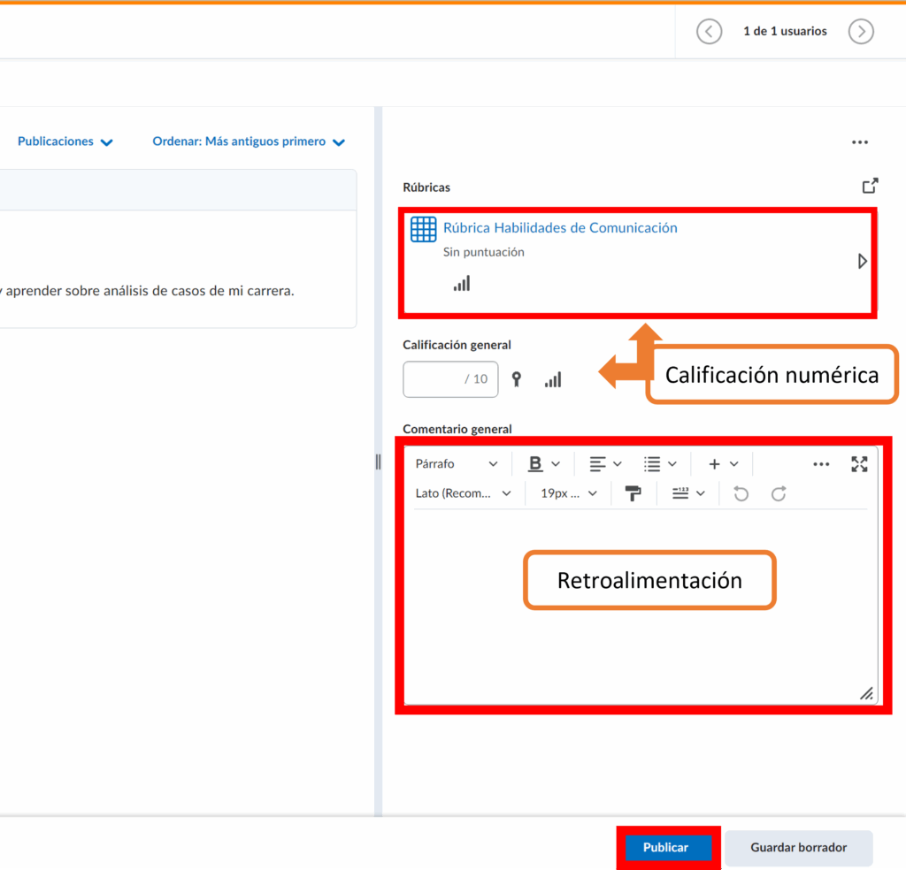En el lado derecho podrás utilizar la rúbrica que hayas asociado y con ello asignar la puntuación numérica. Asimismo, en el recuadro podrás agregar una retroalimentación para tu evaluación cualitativa.