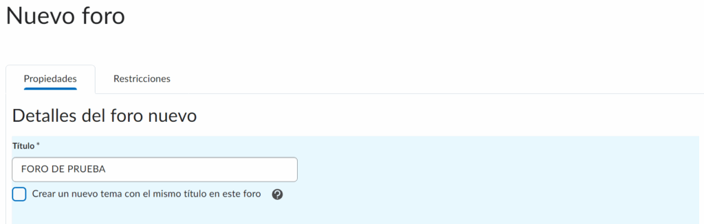 Paso 3 En la pestaña de propiedades, debemos escribir el título del Foro.
