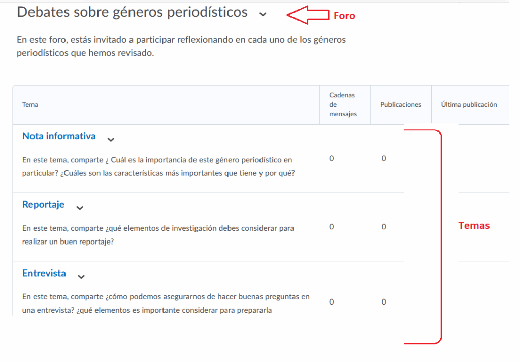 Un Foro, es una “carpeta” que contendrá los temas. Únicamente tenemos la opción de agregarle texto para instrucciones o descripción, pero no cuenta con espacios para debate. Por otro lado, los Temas, son los espacios para el debate y la interacción.