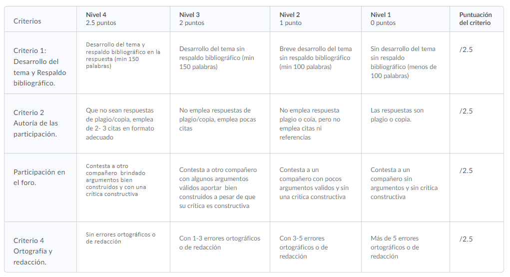 El foro se puede calificar con criterios previamente establecidos; sin embargo, lo ideal es establecer y agregar una rúbrica para que el proceso sea más ágil y objetivo para los alumnos.