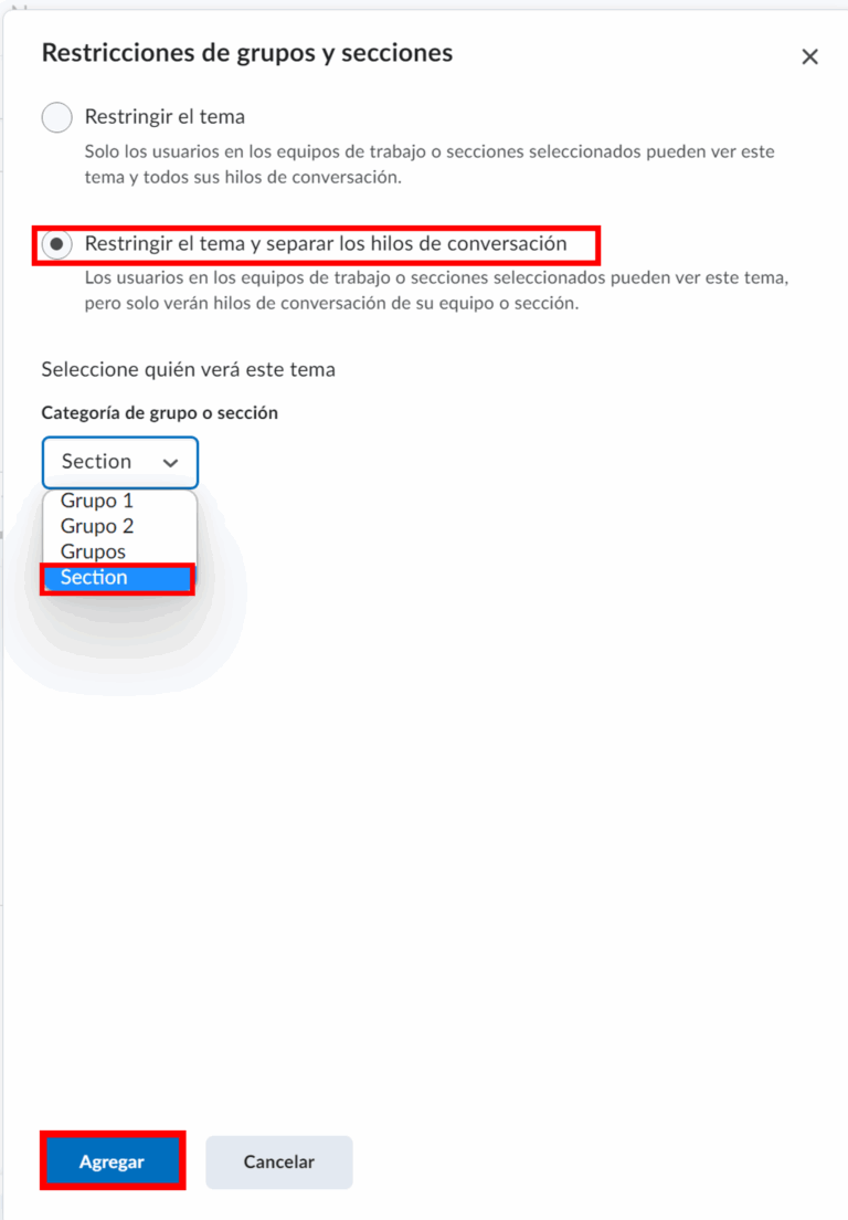 Paso 2: Selecciona la opción de ”Restringir el tema y separar los hilos de conversación”. y posteriormente da clic en ”Sections”.