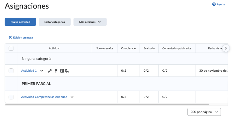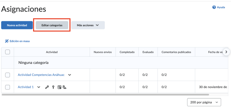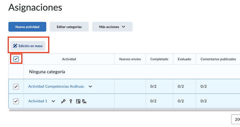 Paso 6. Seleccionamos las casillas de las actividades, y damos clic a edición en masa.