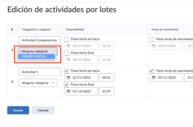Paso 7. Asignamos la categoría a cada una de nuestras actividades y al finalizar, damos clic en guardar.