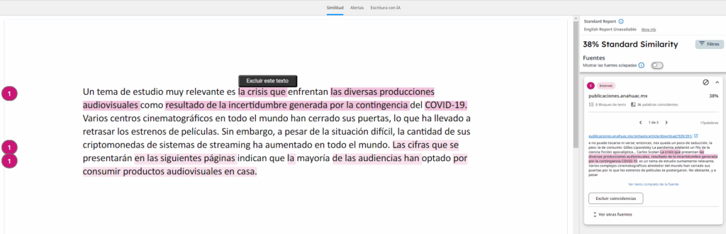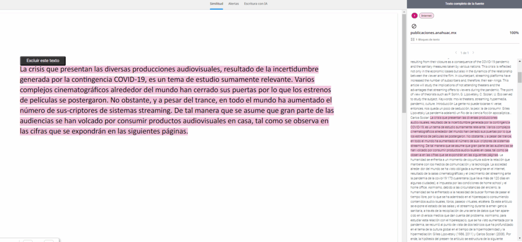 Si bien nos presenta la fuente de ese 38% de la fuente original, resulta complicado saber si el alumno esta cometiendo una infracción a la integridad académica o si realmente es autor de dicho texto.