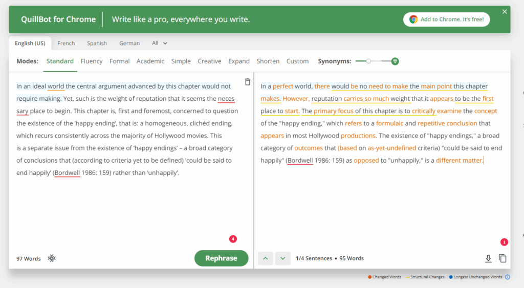En este ejemplo estoy tomando este texto de un libro en inglés, lo parafraseamos con Quillbot y podemos notar como el porcentaje de similitud baja considerablemente (aunque Turnitin mantenga la fuente original de texto).