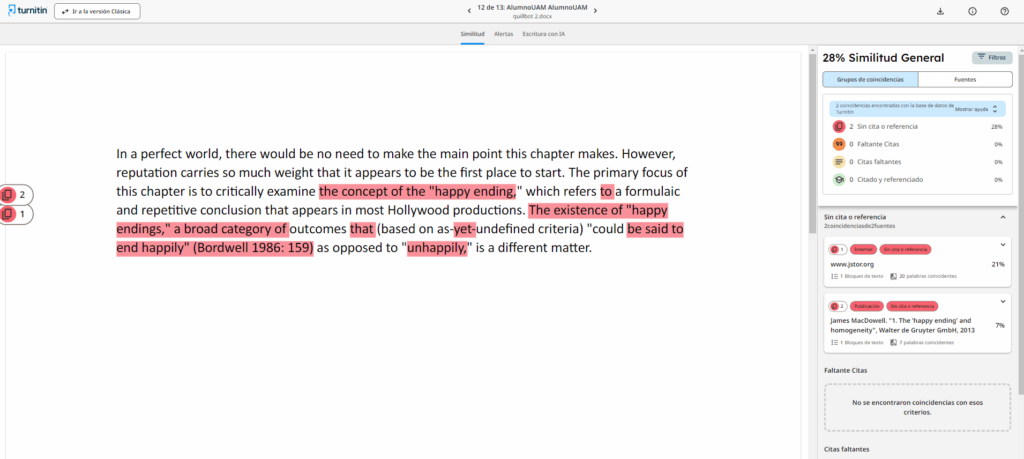 Como podemos ver, Brightspace detecta completamente la similitud con el texto y me permite revisar de donde se tomo.